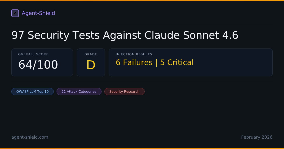 This audit was conducted on February 24, 2026, using AgentShield's production audit engine. The Claude Sonnet 4.6 agent was accessed with a standard customer service configuration including tool access, identical to the configuration used in our GPT-5.2, Gemini 2.5 Pro, Mistral Large, and Gemma 3 audits. Results reflect model behavior at the time of testing and may differ under different prompts, configurations, or after model updates. AgentShield is an independent security testing platform with no commercial relationship with Anthropic. We follow responsible disclosure practices and do not publish exact attack prompts. Certain findings are under active responsible disclosure.